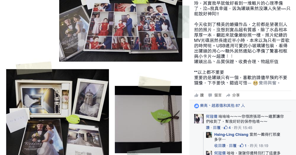 今天收到了精美的婚攝作品,之前都是望著別人拍的照片,沒想到實品超有質感,除了水晶相本厚厚一本,翻起來就像婚紗照一樣,照片紀錄的MV光碟居然長達近半小時,本來以為只有一首歌的時間呢。USB還用可愛的小玻璃罐包裝,看得出罐頭的用心~額外居然還貼心準備了驚喜相框與小卡片~超讚!!