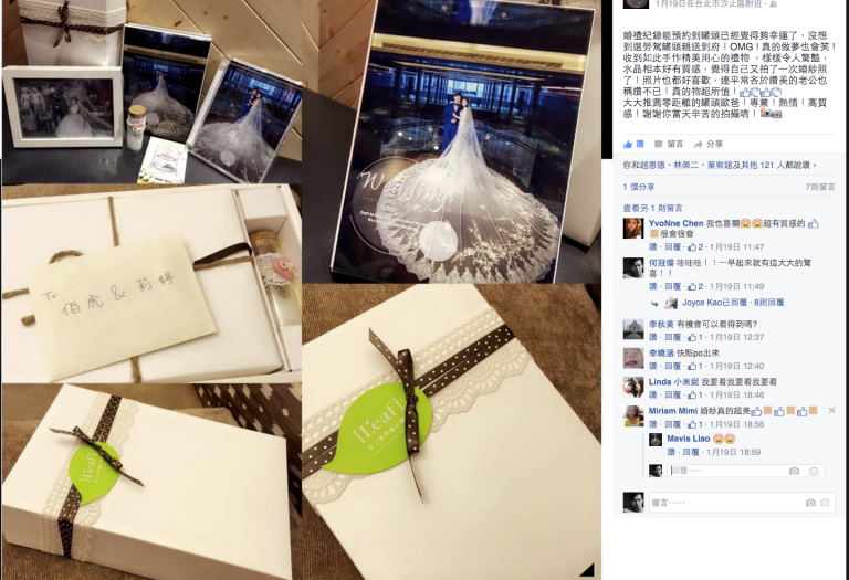 0 推薦婚攝罐頭-我的超讚零距離婚攝 婚禮紀錄能預約到罐頭已經覺得夠幸運了,沒想到還勞駕罐頭親送到府!OMG ! 真的做夢也會笑 ! 收到如此手作精美用心的禮物 ,樣樣令人驚豔,水晶相本好有質感,覺得自己又拍了ㄧ次婚紗照了!照片也都好喜歡,連平常吝於讚美的老公也稱讚不已!真的物超所值!👍👏👍👏 大大推薦零距離的罐頭歐爸!專業!熱情!高質感!謝謝你當天辛苦的拍攝唷!📸📷 文章網址:https://www.facebook.com/hun.she.1/posts/10207470285627550